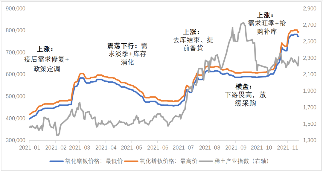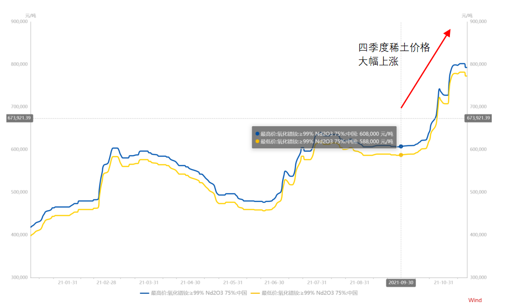 10月至今稀土价格大涨,背后是限电对供给造成了冲击,且四季度是需求旺季,下游开始抢购补库存。
