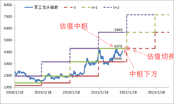 今天军工龙头指数收在4474点,处于透支明年(绿色虚线)盈利增长的合理价位的下方。根据经验,当前估值还是处于中枢以下。