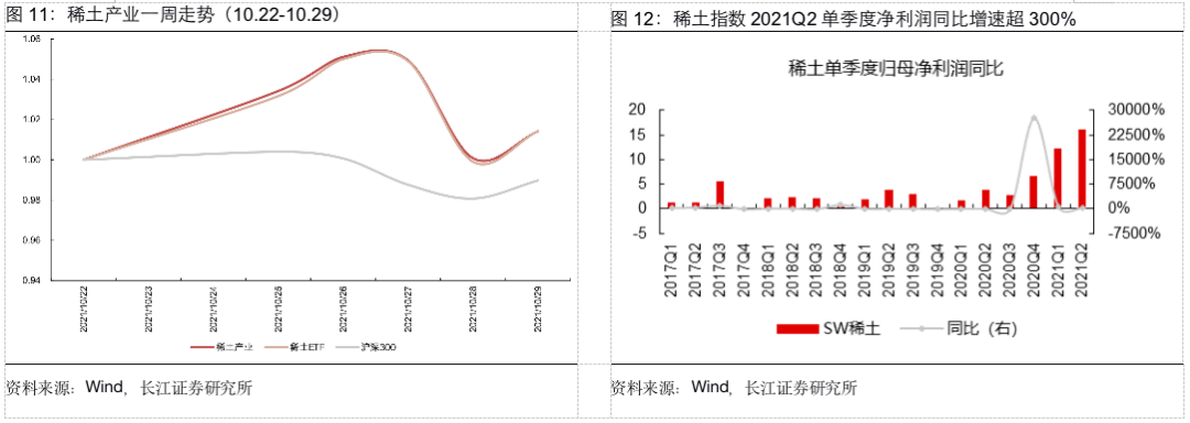 两周表现回顾:10月22日至10月29日稀土产业指数的收益率为1.42%,跑赢沪深300的-1.03%;稀土产业指数行情波动较大。稀土产业指数年初至今的收益率为60.65%,大幅跑赢沪深300的-5.81%。