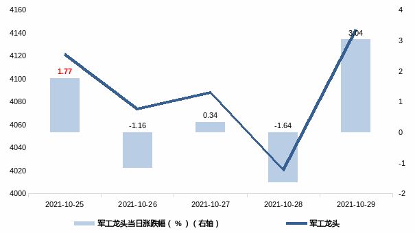 上周表现回顾:上周军工龙头指数总体上行,全周涨跌幅为0.51%。其中,周二、周四下跌,跌幅分别为-1.16%、-1.64%,周一、周三、周五上涨,涨幅分别为1.77%、0.34%、3.04%。