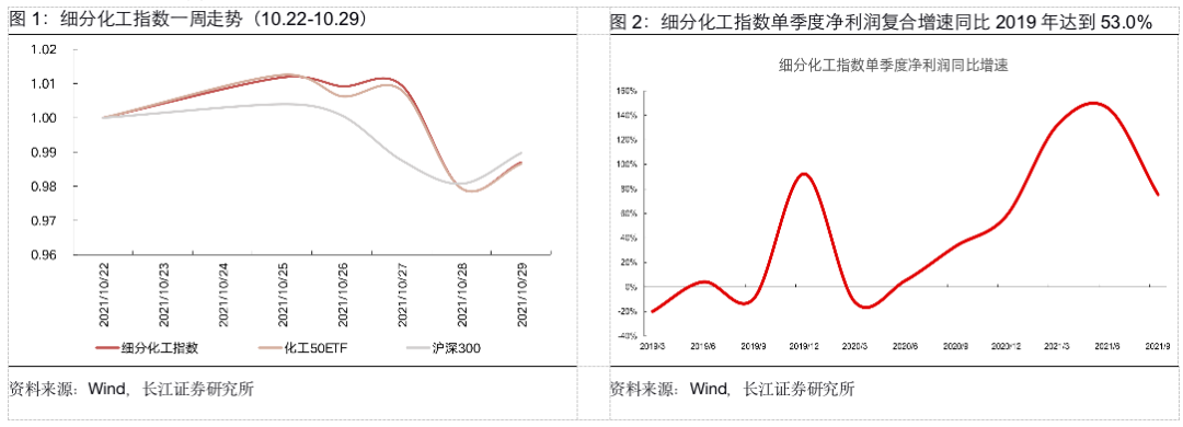 三季报情况:三季报业绩数据略低预期,主要由于煤炭等资源品价格上涨导致化工企业利润被挤压,部分细分化工赛道业绩仍较好;细分化工整体的三季报净利润增速到达114.0%,较2019年三季报净利润的复合增速达到53.2%,行业整体增速较快。