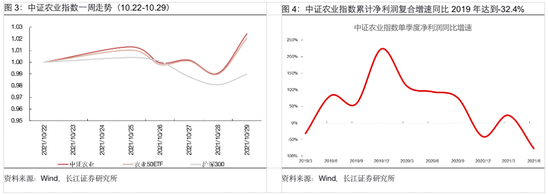 三季报情况:中证农业成分股全部公司均披露了业绩预告;由于猪价持续维持低位水平,业绩增速相对较低,大部分养殖企业业绩尚未转正;中证农业整体的三季报净利润同比增速为-77.0%,较2019年三季报净利润的复合增速达到-32.4%,行业整体增速恢复至正常水平。