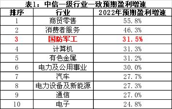 3.未来国防军工板块大概率维持高增速,行业景气度无忧。十四五期间,需求端:1)我国先进装备从数量和结构上较美国均存在较大差距,迭代需求迫切;2)武器列装叠加全面加强实战化军事训练,装备消耗量显著增加;供给端:1)“十四五”阶段多种新型号将列装批产;2)军费保障充足,且仍有明显的提升空间。根据分析师一致预期数据,2022年国防军工板块一致预期净利润增速为31%,在28个中信一级行业中排名第3/28,业绩确定性较高。