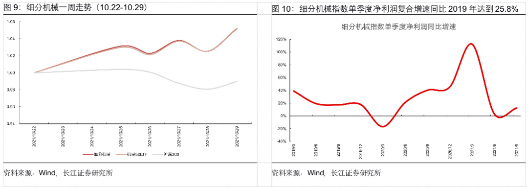 三季报情况:上半年受益于海外出口较强,三季度内需有所回落,整体机械行业的景气度较高;细分机械整体的三季报净利润增速到达27.8%,较2019年三季报净利润的复合增速达到22.5%,机械行业整体景气度仍处于高位。