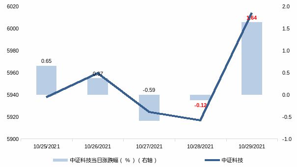 上周表现回顾:上周中证科技指数总体上行,全周涨跌幅为1.29%。其中,周三、周四下跌,跌幅分别为-0.59%、-0.12%,周一、周二、周五上涨,涨幅分别为0.65%、0.37%、1.64%;收于6014.17。