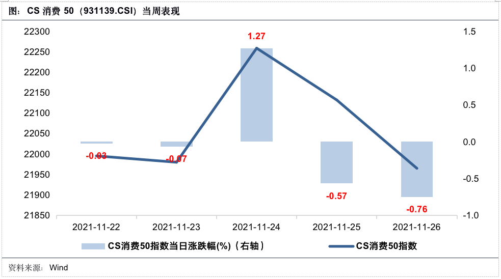 上周表现回顾:上周CS消费50指数连续下行,周三小幅回升,累计下跌0.16%,相较沪深300指数跑赢0.45%。
