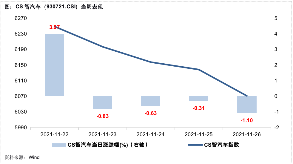 上周表现回顾:上周CS智汽车指数在周一上涨,随后四个交易日连续下行,累计上涨1.01%,相较沪深300指数跑赢1.62%。