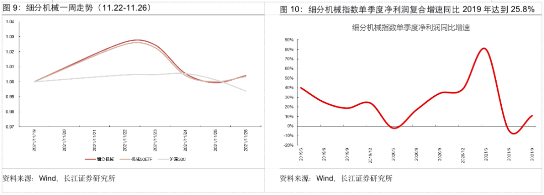 三季报情况:前三季度受益于海外出口较强,机械行业的景气度较高;细分机械成分股中所有公司均披露了三季度;细分机械整体的三季度单季度净利润增速到达12.4%,较2019年三季报净利润的复合增速达到25.8%,机械行业整体景气度仍处于高位。
