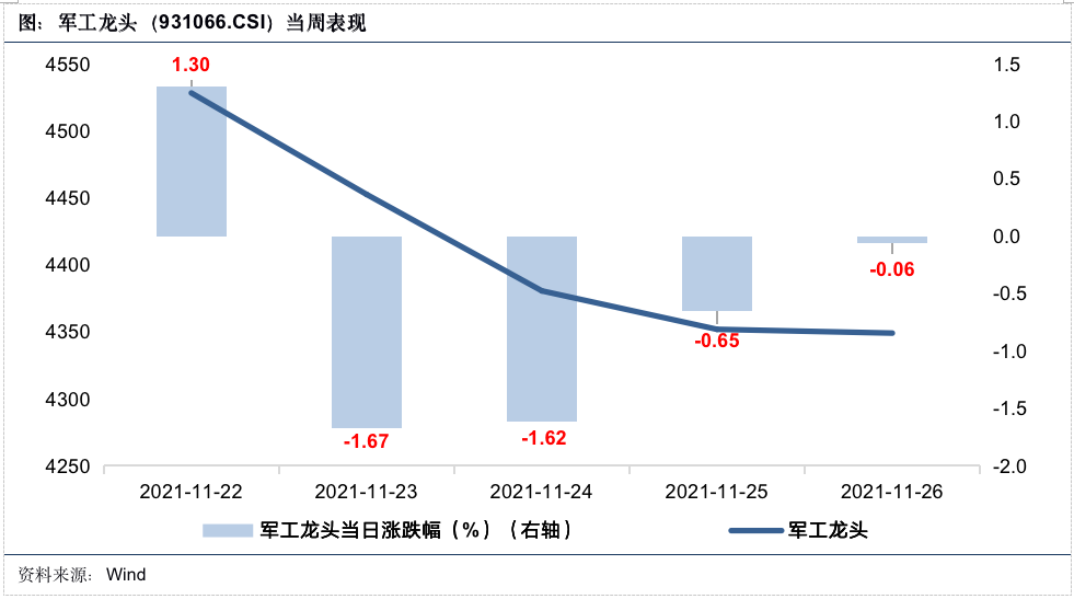 上周表现回顾:上周军工龙头指数总体下行,全周涨跌幅为-3.95%。其中,周二、周三、周四、周五下跌,跌幅分别为-1.67%、-1.62%、-0.65%、-0.06%,周一上涨,涨幅为1.30%;收于4349.02。