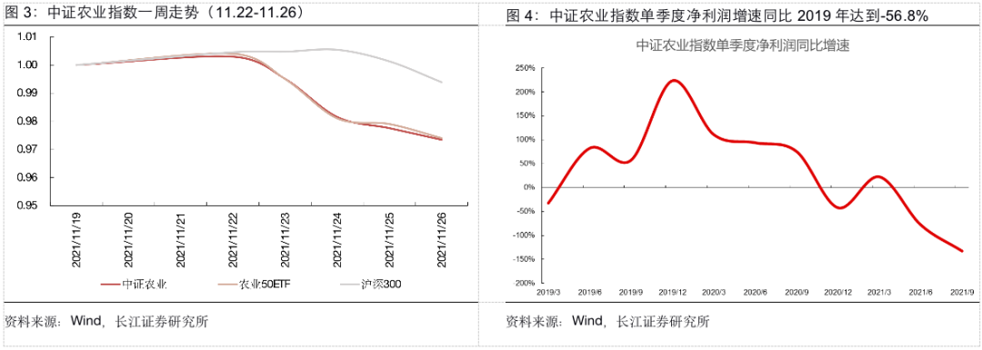 三季报情况:中证农业成分股全部公司均披露了三季报;由于前三季度猪价维持低位水平,单季度行业整体净利润为负;中证农业整体的三季报净利润增速到达-129.1%,行业整体增速仍在持续下行。