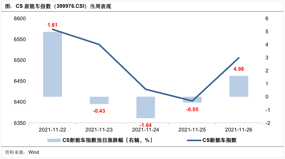 上周表现回顾:11月22日至11月26日跟踪标的新能源车指数(930997.CSI)呈现震荡行情,周三录得七日内最大跌幅1.64%,周五达到本周最大涨幅4.98%,截至周五收盘指数上涨4.89%,跑赢大盘4.51%。