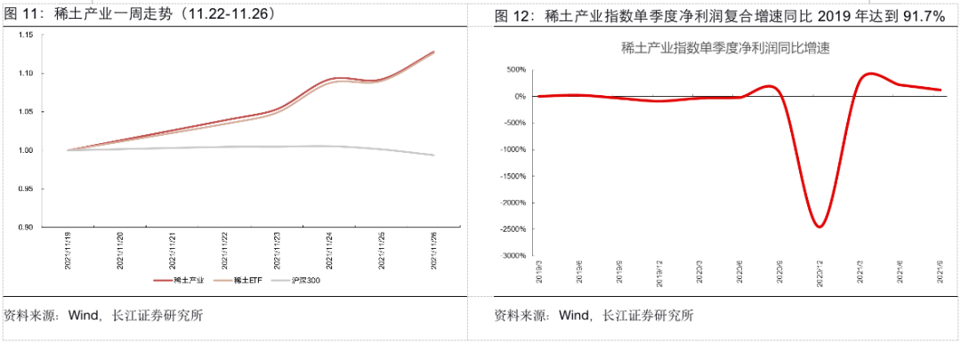 本周来看,板块主要受到2个催化,1)过去1月稀土价格大幅上涨,稀土永磁企业直接收益,涨价为板块行情发酵奠定了非常好的基础;2)上周美国出台新能源帮扶政策利好整体新能源板块,稀土永磁作为新能源上游材料标的整体受益;3)11月22日,工信部、市场监管总局联合印发《电机能效提升计划(2021-2023年)》的通知,主要目标为到2023年,高效节能电机年产量达到1.7亿千瓦,在役高效节能电机占比达到20%以上。节能电机的发展将显著提振稀土永磁需求。