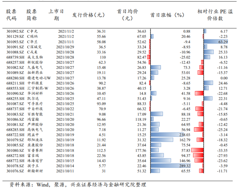 破发的根本原因或许在于:发行价格上行。根据统计,10月22日(新股开始频繁破发的起始日)后上市的大部分个股,上市估值显著高于行业估值,这与10月22日之前,形成明显的对比(具体数据见表1中的“相对行业PE溢价倍数”)。