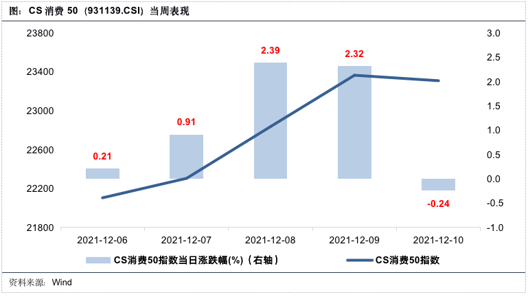 上周情况:上周消费板块有大幅回弹,其中社服,食品饮料,家电等板块均有不错表现,11月份CPI同比上涨2.3%,环比+0.8%,CPI重回“2区间”,CPI-PPI结束18个月的回落,见底回升至-10.6%。此外新冠特效药也对市场有一定的提振作用,周五中央经济工作会议结束,对于明年的整体经济发展有定调,稳增长是核心问题,消费或将触底回升。