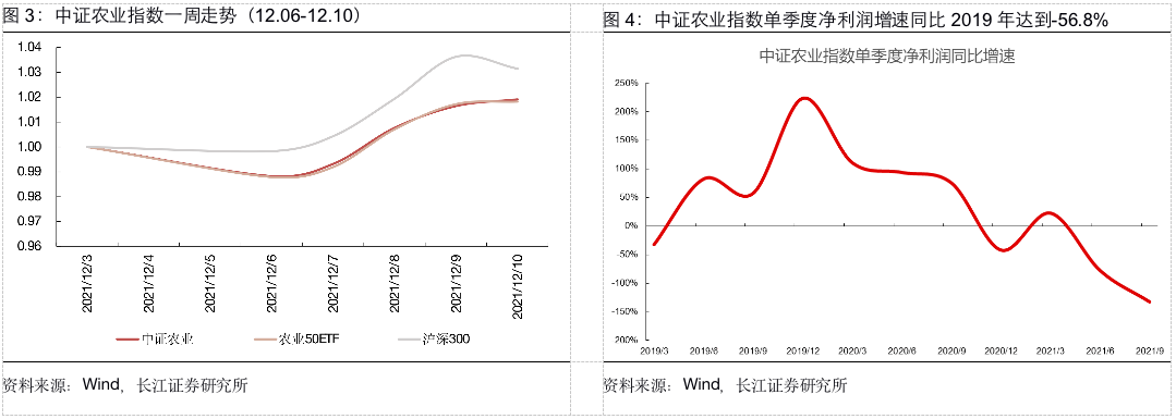 三季报情况:中证农业成分股全部公司均披露了三季报;由于前三季度猪价维持低位水平,单季度行业整体净利润为负;中证农业整体的三季报净利润增速为-129.1%,行业整体增速仍在持续下行。