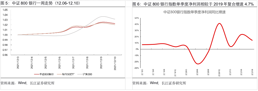 三季报情况:中证800银行成分股全体公司均已披露三季报;银行板块整体的三季报单季度净利润同比增速为14.4%,较2019年三季报净利润的复合增速达到4.7%,行业整体净利润增速较快,盈利能力已经恢复至2019年的水平。