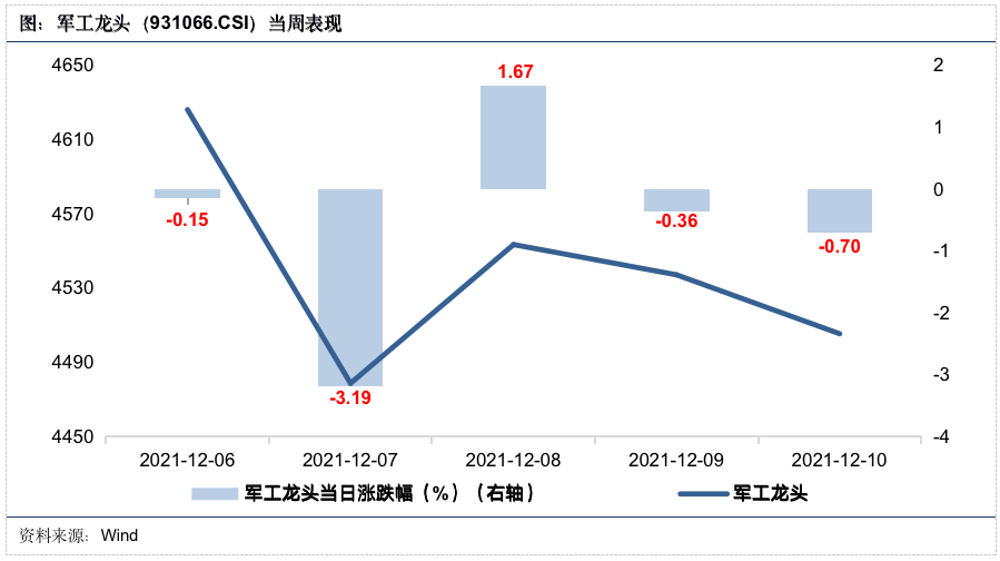 上周表现回顾:上周军工龙头指数总体下行,全周涨跌幅为-2.61%。其中,周一、周二、周四、周五下跌,跌幅分别为-0.15%、-3.19%、-0.36%、-0.70%,周三上涨,涨幅为1.67%;收于4505.24。