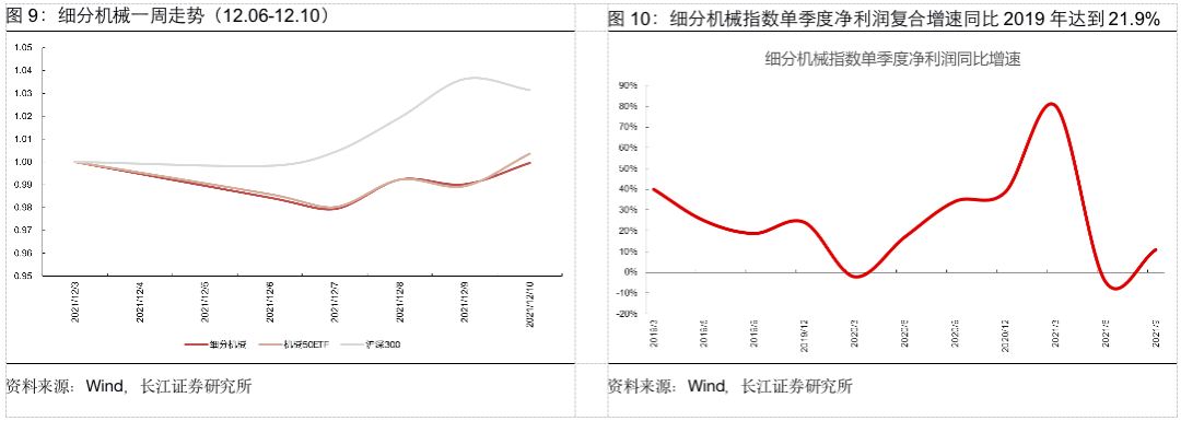 三季报情况:前三季度受益于海外出口较强,机械行业的景气度较高;细分机械成分股中所有公司均披露了三季度;细分机械整体的三季度单季度净利润增速到达12.4%,较2019年三季报净利润的复合增速达到25.8%,机械行业整体景气度仍处于高位。