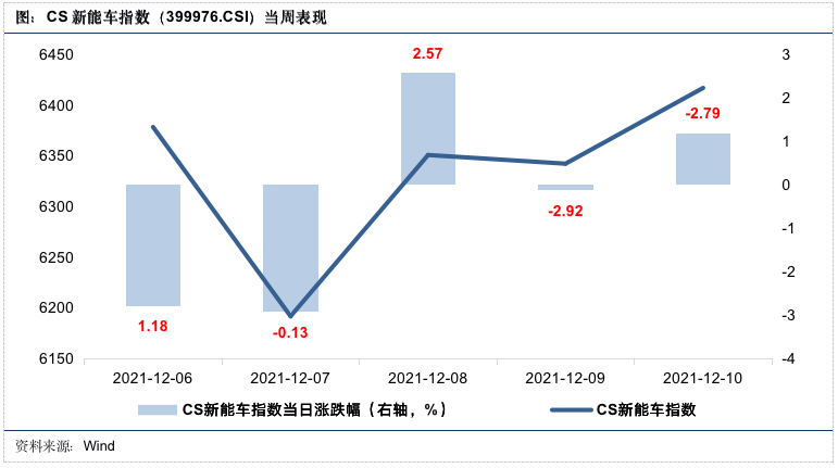 上周表现回顾:12月6日至12月10日,跟踪标的新能源车指数(930997.CSI)呈现震荡行情,周三录得七日内最大跌幅2.57%,周四达到本周最大跌幅2.92%,截至周五收盘指数下跌2.21%,跑输大盘5.35%。