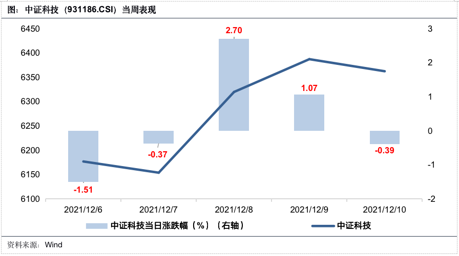 上周表现回顾:上周中证科技指数总体上行,全周涨跌幅为3.01%。其中,周三、周四上涨,涨幅分别为2.70%、1.07%,周一、周二、周五下跌,跌幅分别为-1.51%、-0.37%、-0.39%;收于6362.28。