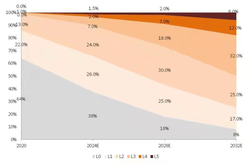 图:未来几年L0-L5级别智能汽车渗透率走势