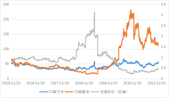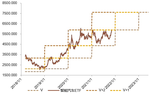 结合估值和盈利逻辑,根据股价=估值*盈利,如果我们用38倍估值(CS智汽车指数历史估值中枢附近),分别乘以当年、次年、后年的盈利预期,可以得到透支当年、明年、后年盈利预期之后的合理价位。从这个角度来看,目前智能汽车估值已经透支了明年的业绩预期,意味着估值大概处于中枢位置,当前来看,估值不算贵但也不算便宜。但考虑到年末估值切换逻辑,当下的价格就相对具备投资价值了。