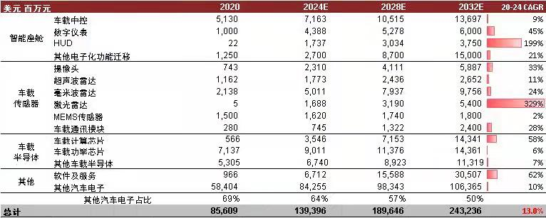 (一)渗透率提升超预期:上半场电动化,下半场智能化。当前我国新能车渗透率快速提升至16%,续航等电动化问题已经趋于成熟。但是智能驾驶、智能座舱、人机互动等新成为自主品牌厂商差异化竞争的决战场,汽车智能化进程显著加快。根据中金证券预测,我国L1及以上智能汽车渗透率将从2020年的9%增长到2024年的17%,类似于2018-2021年新能车渗透率的提升对产业链业绩的拉动,未来几年,智能汽车产业链的年化复合增速达到13%,其中激光雷达、HUD等的年化复合增速达到200%以上。渗透率提升有望带动智能汽车业绩进入高速增长期。2021广州车展,各车型均预装大量L3硬件,对应L3 辅助驾驶芯片2022年出货100万片,同比增速达100%,大超市场预期,L3渗透率快速提高。