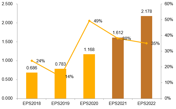 短期来看,新能源汽车维持高增长态势,而电动平台是智联网系统最好的载体,因此新能源汽车的发展有利于加快智能汽车的发展进程。从盈利增速预期来看,2021年净利润增速预期为38%,2022年净利润增速预期为35%。连续两年维持这么高的增速,基本面景气度还是很高的。