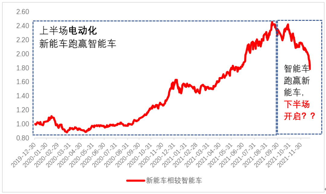 2021年9月至今,新能车指数跌了5%,智能车指数反而上涨了25%,新能车比智能车少赚了30%。