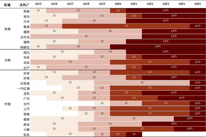 图:各车厂自动驾驶级别车辆推出时间表