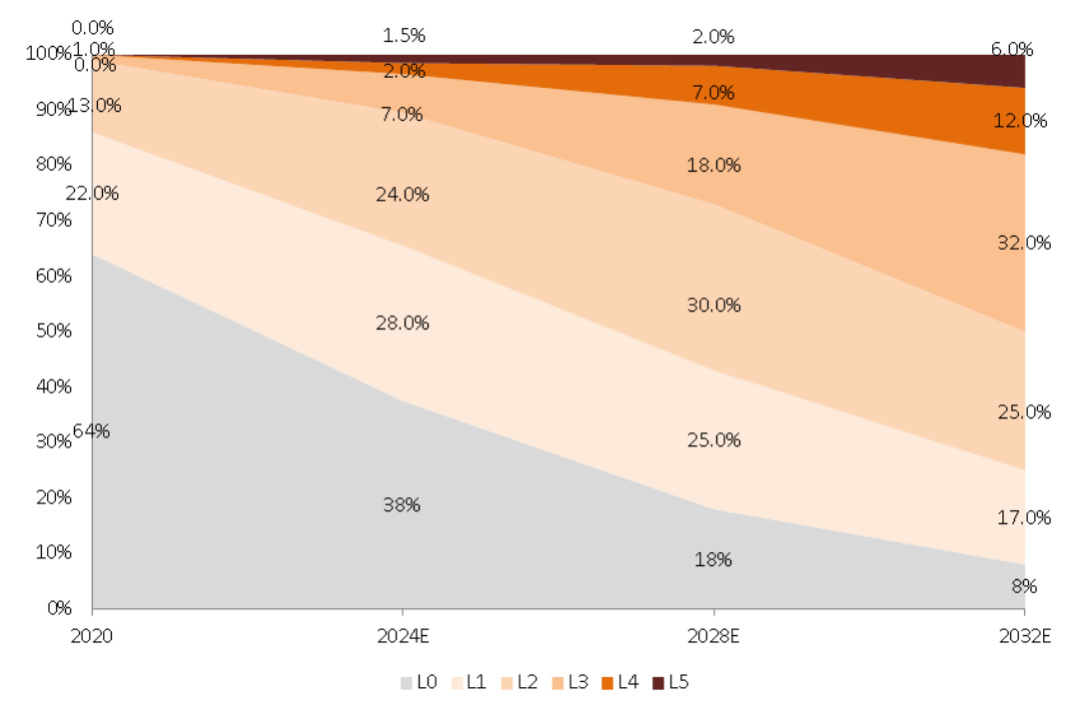 图:L0-L5自动驾驶级别车辆渗透率预测