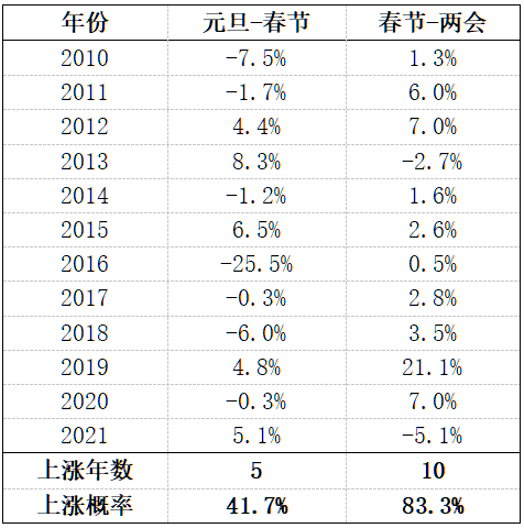 ➤(4) 可能还会有“春季躁动”:根据历史数据,春节后A股上涨概率相对较高。具体来说,2010年以来,“元旦-春节”期间万得全A指数上涨概率只有41.7%,而“春季-两会”期间上涨概率达到83.3%。因此历史上所谓的春季躁动,一般在春节之后,而非春节之前。