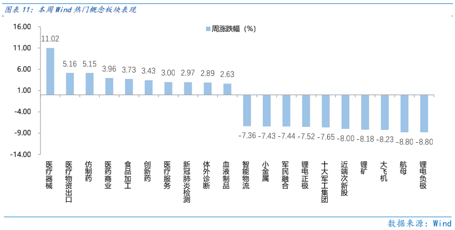本周医保局表态对于创新器械暂不集采,叠加期卫健委出台财政贴息贷款政策,医药板块收益领涨。从Wind热门概念板块来看,表现相对靠前的是医疗器械(11.02%)、医疗物资出口(5.16%)、仿制药(5.15%)、医药商业(3.96%)、食品加工(3.73%);表现相对靠后的是锂电负极(-8.8%)、航母(-8.8%)、大飞机(-8.23%)、锂矿(-8.18%)、近端次新股(-8%)。