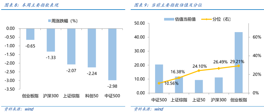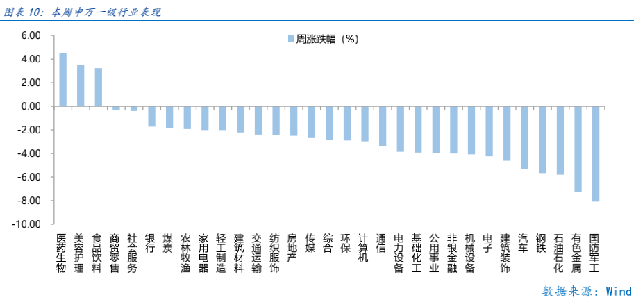 近一周,上证指数下跌2.07%,创业板指下跌0.65%,沪深300下跌1.33%,中证500下跌2.98%,科创50下跌2.24%。风格上,消费、金融表现相对较好,周期、成长表现较差。从申万一级行业看,表现相对靠前的是医药生物(4.48%)、美容护理(3.51%)、食品饮料(3.23%)、商贸零售(-0.32%)、社会服务(-0.4%);表现相对靠后的是国防军工(-8.08%)、有色金属(-7.27%)、石油石化(-5.8%)、钢铁(-5.67%)、汽车(-5.31%)。