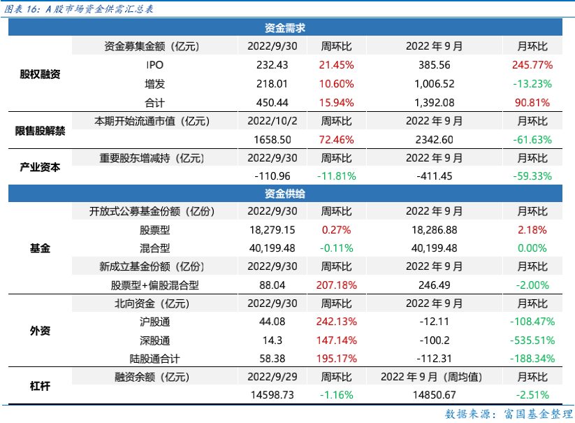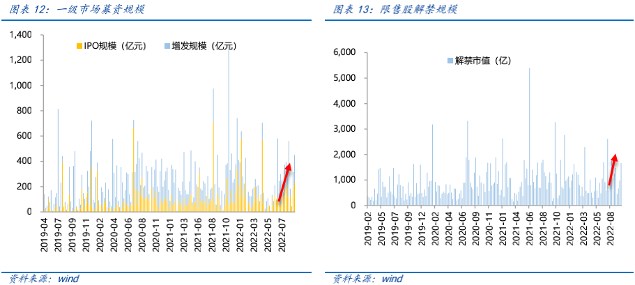 资金需求方面,本周一级市场规模有所增加,限售股解禁压力下行,重要股东减持。本周一级市场资金募集金额合计450.44亿元,较上增加15.94% ;结构上,IPO募集232.43亿元,周环比增加21.45% ;增发募集218.01亿,周环比增加10.6% 。本周限售股解禁规模合计1658.5亿元,周环比增加72.46% ,根据目前披露的数据,预计下周解禁规模约329.7亿元,解禁压力有所下行。本周重要股东减持110.96亿元,上周减持67.37亿元。