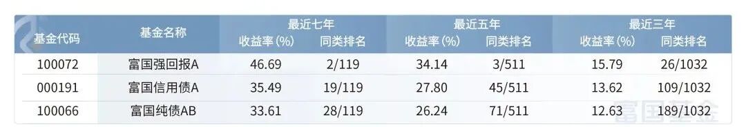 这几只产品中,成立时间超5年且业绩表现居前的产品包括富国强回报(A类100072)、富国信用债(A类000191)、富国纯债AB(100066),据海通证券数据显示,截至2022年9月30日,这3只纯债基金近7年业绩分别为46.69%、35.49%、33.61%,其中,富国强回报在同类排名中遥遥领先,位居第二位。