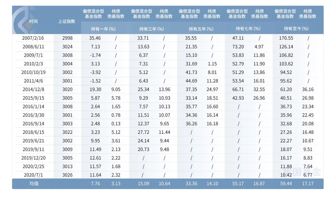而偏债混合型指数除了持有1年时,仅有3次收益率为负,上表中其他历史时刻买入并持有超过1年,模拟收益率表现也相对可观。在历史过往3000点附近持有1年、3年、5年、7年的平均模拟收益率分别为7.76%、15.09%、33.36%、55.17%,持有时间越长,收益率越高,这也是为何我们要坚持长期投资的理由。