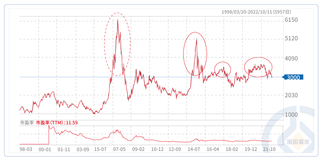 注:数据来源Wind,截至2022年10月10日,指数历史收益情况不预示其未来表现,不构成对任何单只基金业绩表现的保证。筛选方法:1)优先选取上证指数3000-3030点之内离3000点最近的日期;2)除此之外由于个别牛市期间的上涨较快,适当选取低于3000点的日期,数据中只有2007-2-16为这一标准;3)在同一年中由于震荡导致多数月份都在3000的附近,对过于近的时间点做提出处理,选取年初、年中、年尾三个日期.。其中,年化收益率=[(1+区间收益率)^(250/交易日天数)-1]*100%。