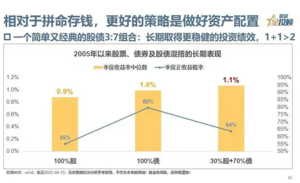 如图所示,选择较少部分权益、较大部分固收组合的资产配置,如偏债混合型基金,可能会实现1+1>2的效果。2005年以来从季度收益率中位数、季度正收益的历史概率来看,股债3:7的组合分别为1.1%和64%,高于股票季度收益中位数0.9%和55%的季度正收益概率。