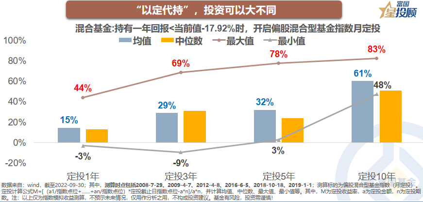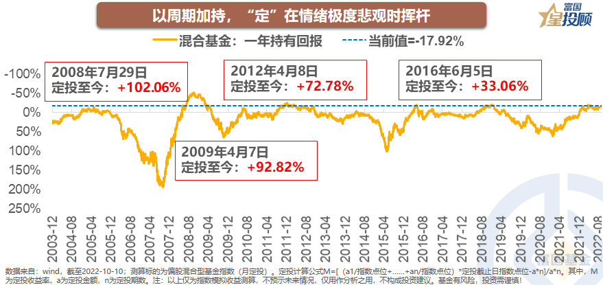以周期加持,“定”在情绪极度悲观时挥杆。周期思维有助于让我们明白当前所在的位置,截至2022-09-30,混合基金一年持有回报率为-17.92%,处于仅次于2008年国际金融危机的极端时期,否极泰来是未来大概率事件。其次,周期底部的定投,是参与到市场的好方式。在每一次混合基金一年持有回报率,小于-17.92%时开启月定投,定投至今的收益率均值,超过75%。