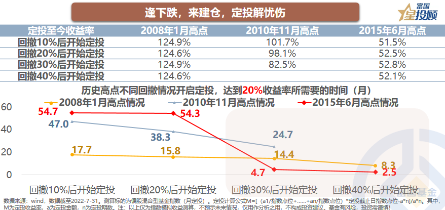逢下跌,来建仓,定投解忧伤。定投或许还能“避免”错失市场反弹的机会。数据显示,随着市场回撤逐步加大,达成20%定投收益目标的时间在缩短。且2008年和2015年高点回撤40%后,实现20%的目标仅需要8.3个月和2.5个月。下跌中不应该只有悲观,定投播种的时刻或许也到了!