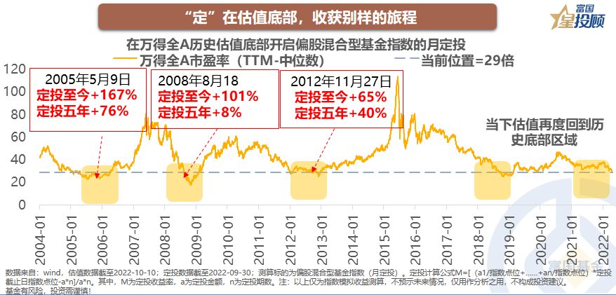 “定”在估值底部,收获别样的旅程。著名投资大师,霍华德·马斯克在他的《投资最重要的事》中说:均值回归好比钟摆,我们知道它一定会左右摆动。但是在股市中,你永远不知道这个钟摆,会在时钟的两端停留多久。但用定投的方式参与市场,总不会出大错。数据显示,在历史估值底部的2005年、2008年、2012年,开启月定投至今的收益率均超过65%,而坚持定投五年的收益率均值,超过40%。