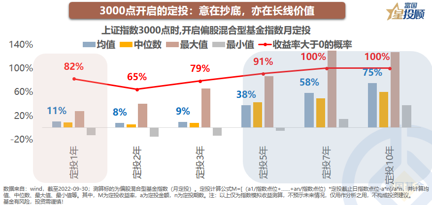 3000点开启的定投:意在抄底,亦在长线价值。抄底时有三大陷阱:抄底抄在半山腰、过早满仓、单一品种仓位太重。如何规避抄底的陷阱?定投,是非常好的策略。数据显示,在上证指数3000点时开启定投,坚持一年的平均收益率,达到11%。同时,随着定投的时间更长,收益率和取得正收益的概率,也在大幅上升。