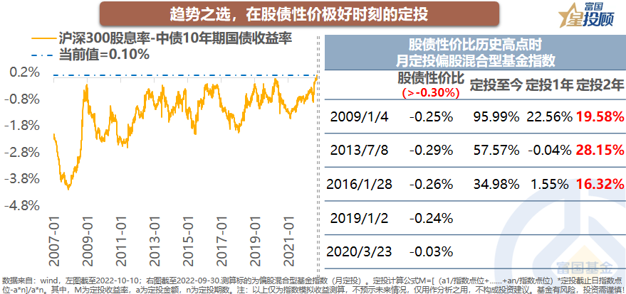 趋势之选,在“股债性价比”极好时刻的定投。当“股债性价比”较好的时刻:即沪深300股息率与中债10年期国债收益率之差,大于-0.03%时,股票市场往往在后期有较好的表现。在“股债性价比”极好的时刻开启月定投,如2009年、2013年、2016年,定投两年的收益率分别为19.58%、28.15%、16.32%。目前,沪深300股债收益率之差,达到历史高点的0.10%,定投是当下的趋势之选。察势者智,顺势者赢,驭势者独步天下。