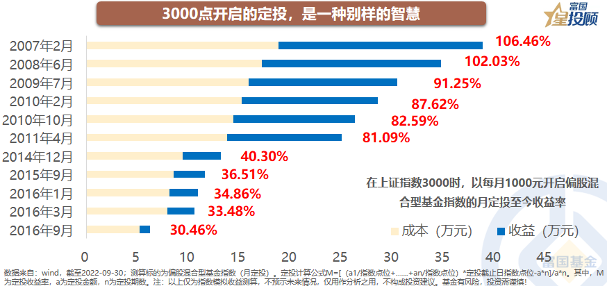3000点开启的定投,是一种别样的智慧。市场总是起起落落,也有不少人等着抄底。但是底究竟在哪儿,并不是每次都能判断准的。反观上证指数3000点时,开启偏股混合型基金指数的月定投,定投至今的收益率均值,接近70%。在悲观时坚守,长期都会有收获。