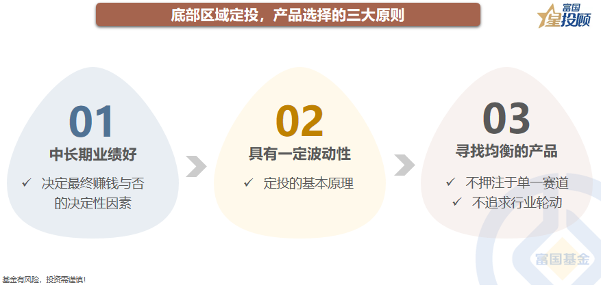 底部区域定投,产品选择的三大原则。底部区域往往行业轮动较快,市场没有明确的主线。所以,在开启定投时,产品选择需满足三大原则:一是,中长期业绩好的产品,这是决定投资是否赚钱的决定性因素;二是,产品净值具有一定的波动性,这是定投的基本原则,否则不如一次性买入;三是,寻找均衡的产品,“不押注”单一赛道,也不追求行业轮动。