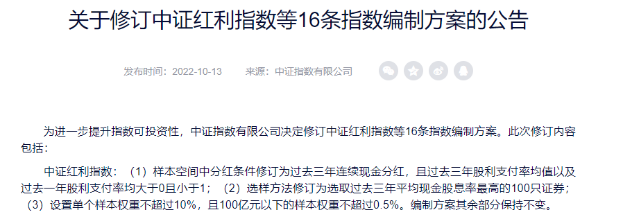 即便如此优秀,红利也没忘了与时俱进、优化表现。今天中证指数公司发布公告,拟修订中证红利指数。指数修订了三个方面,都围绕着一个目标:提高指数的中长期投资价值。