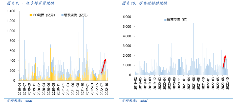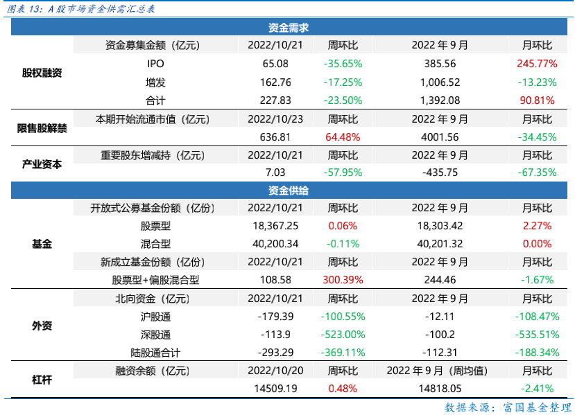 资金需求方面,本周一级市场规模有所减少,限售股解禁压力上行,重要股东减持。本周一级市场资金募集金额合计227.83亿元,较上周减少23.50%;结构上,IPO募集65.08亿元,周环比减少35.65%;增发募集162.76亿,周环比减少17.27%。本周限售股解禁规模合计636.81亿元,周环比增加64.48%,根据目前披露的数据,预计下周解禁规模约605.29亿元,解禁压力有所上行。本周重要股东增持7.03亿元,上周减持1.82亿元。