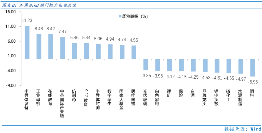 “自主可控”概念持续发酵,半导体板块走强。从Wind热门概念板块来看,表现相对靠前的是半导体设备(11.23%)、工业母机(8.48%)、在线教育(8.42%)、中芯国际产业链(7.47%)、仿制药(5.46%);表现相对靠后的是饲料(-5.95%)、水泥制造(-4.97%)、磷化工(-4.65%)、锂电负极(-4.61%)、品牌龙头(-4.53%)。