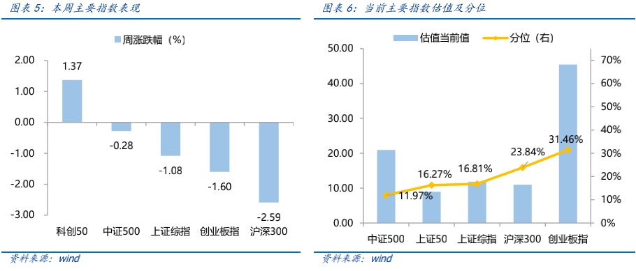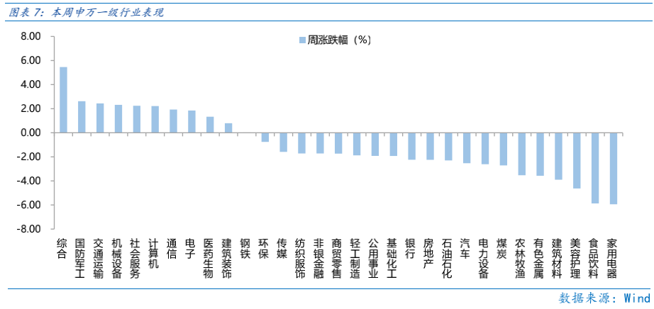近一周,上证指数下跌1.08%,创业板指下跌1.6%,沪深300下跌2.59%,中证500下跌0.28%,科创50上涨1.37%。风格上,成长、稳定表现相对较好,消费、金融表现较差。从申万一级行业看,表现相对靠前的是综合(5.46%)、国防军工(2.62%)、交通运输(2.44%)、机械设备(2.32%)、社会服务(2.24%);表现相对靠后的是家用电器(-5.94%)、食品饮料(-5.87%)、美容护理(-4.63%)、建筑材料(-3.9%)、有色金属(-3.57%)。